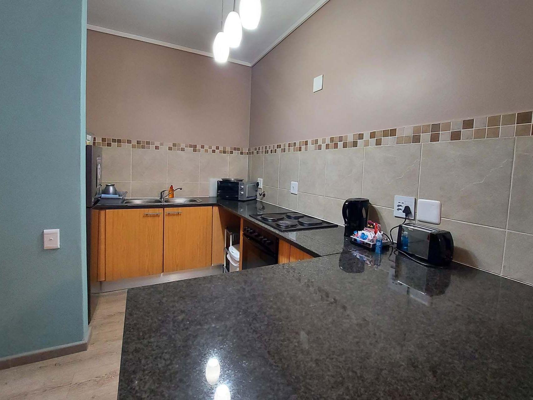 There is a fully-equipped, kitchen with 4-plate oven and stove, microwave, electric kettle, toaster and a full-height fridge and freezer.