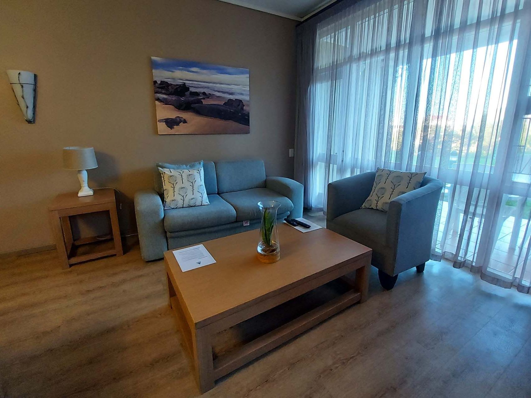 The living area offers a lounge, which has a flat screen television and opens onto a small patio or balcony with a partial sea view.