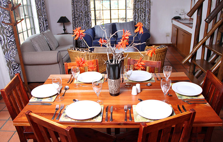 Most of our lodges sleep six people. There are two bedrooms, one with a queen-size bed and the other with twin beds, and a loft area with two single beds. The living area comprises a lounge and dining area and a fully-equipped kitchen. However guests regard the covered patio and braai area, as the piéce de resistance of the lodge with most meals being consumed in the fresh air, in a bush environment. For a more intimate getaway, there are also three four sleeper units, comprising one bedroom and a sleeper couch for two children under 12.