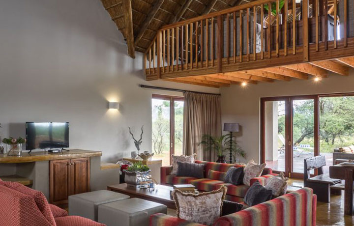 The self-catering luxury villa at Finfoot Lake Reserve is situated only 200 meters from the banks of the Vaalkop Dam. It is spacious, with a large open plan fully-equipped kitchen, lounge and dining room area which opens up onto a wooden wrap around deck which has a medium size pool and braai area. Above the lounge area there is a loft with a timber deck overlooking the dam. The four bedroom villa can comfortably accommodate eight adults and two children. Each bedroom is furnished with ample storage space, dressing table, small lounge area and either a king-size bed or two single beds. The two main bedrooms boast their own en suite bathrooms with double basins and a bath.. There are another two bathrooms, as well as an additional guest toilet and the option of truly being one with nature by trying out the outdoor shower.
