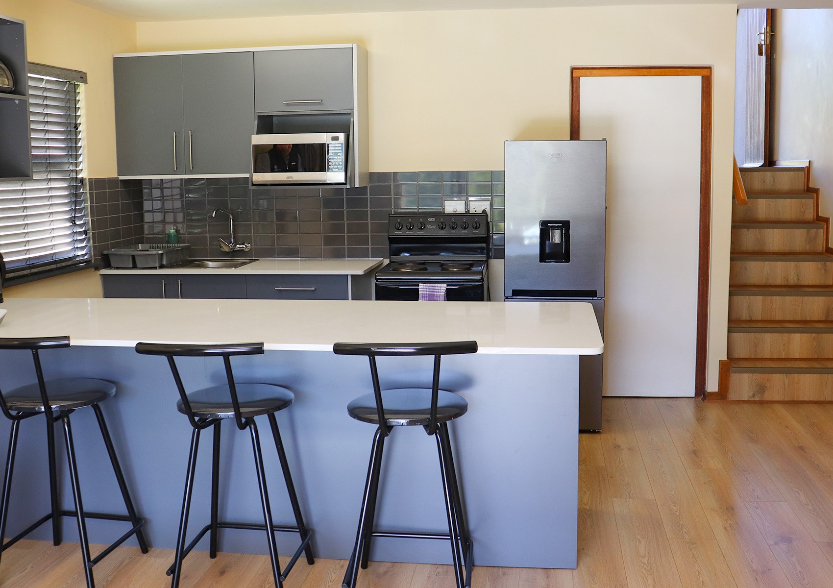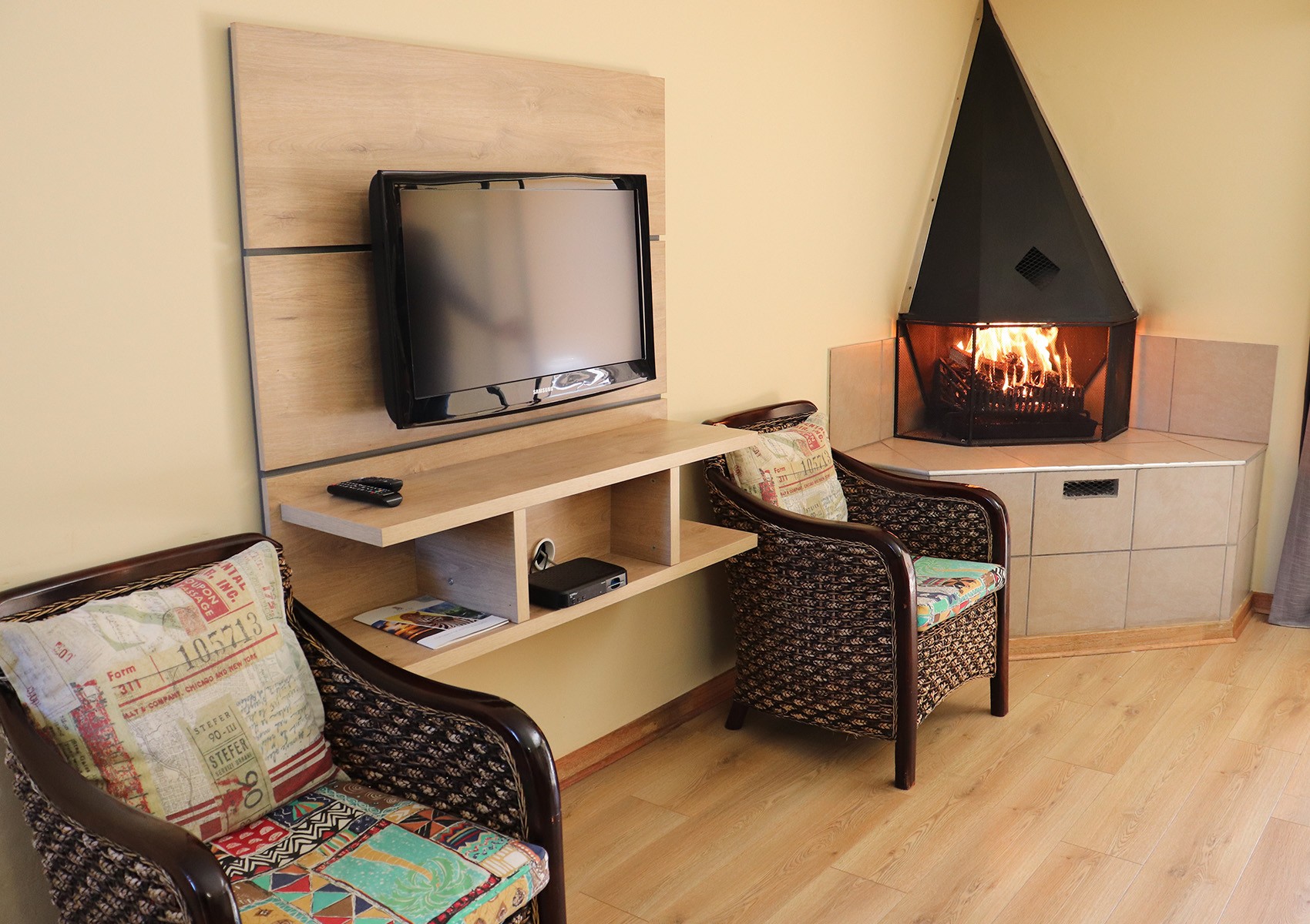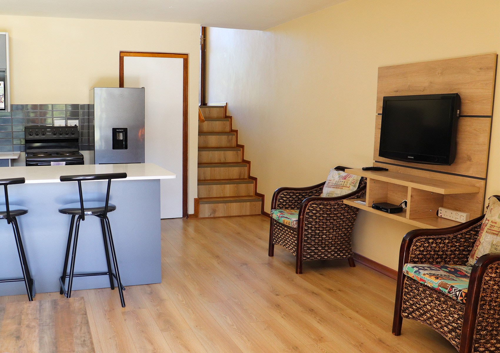 Our 4-Sleeper Chalets feature one bedroom with two separate 3⁄4 beds upstairs, as well as two separate single pull out beds (not sleeper couches) in the downstairs lounge. The en-suite bathroom is located on the ground floor, along with the fireplace and lounge area. For stocking up on self-catering supplies, we have a conveniently situated local “Quick Shop” right at our entrance.