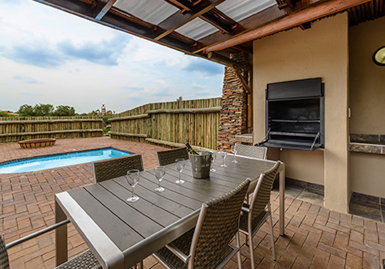 Patio with braai, splash pool and fire pit